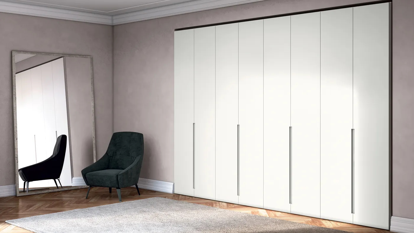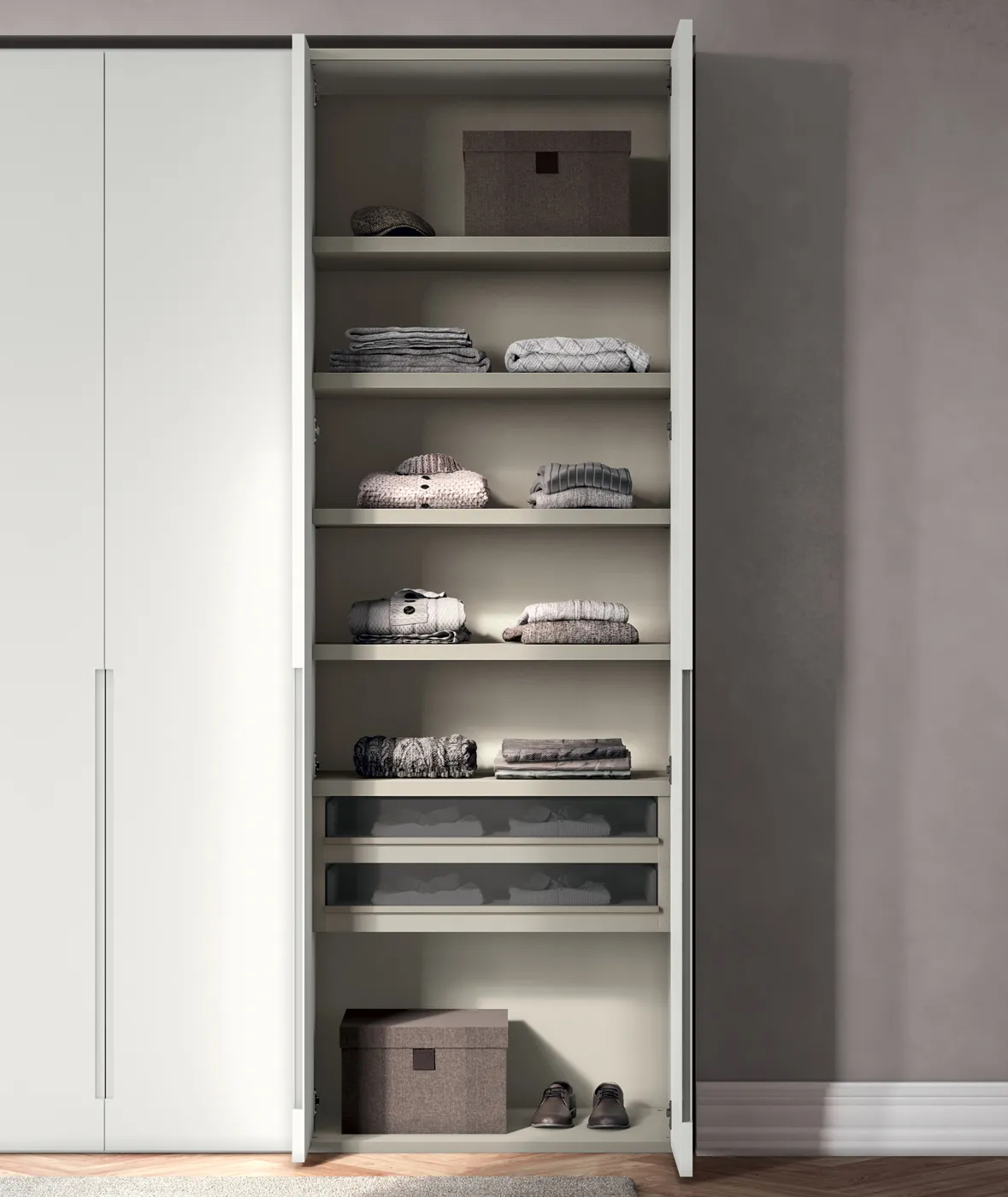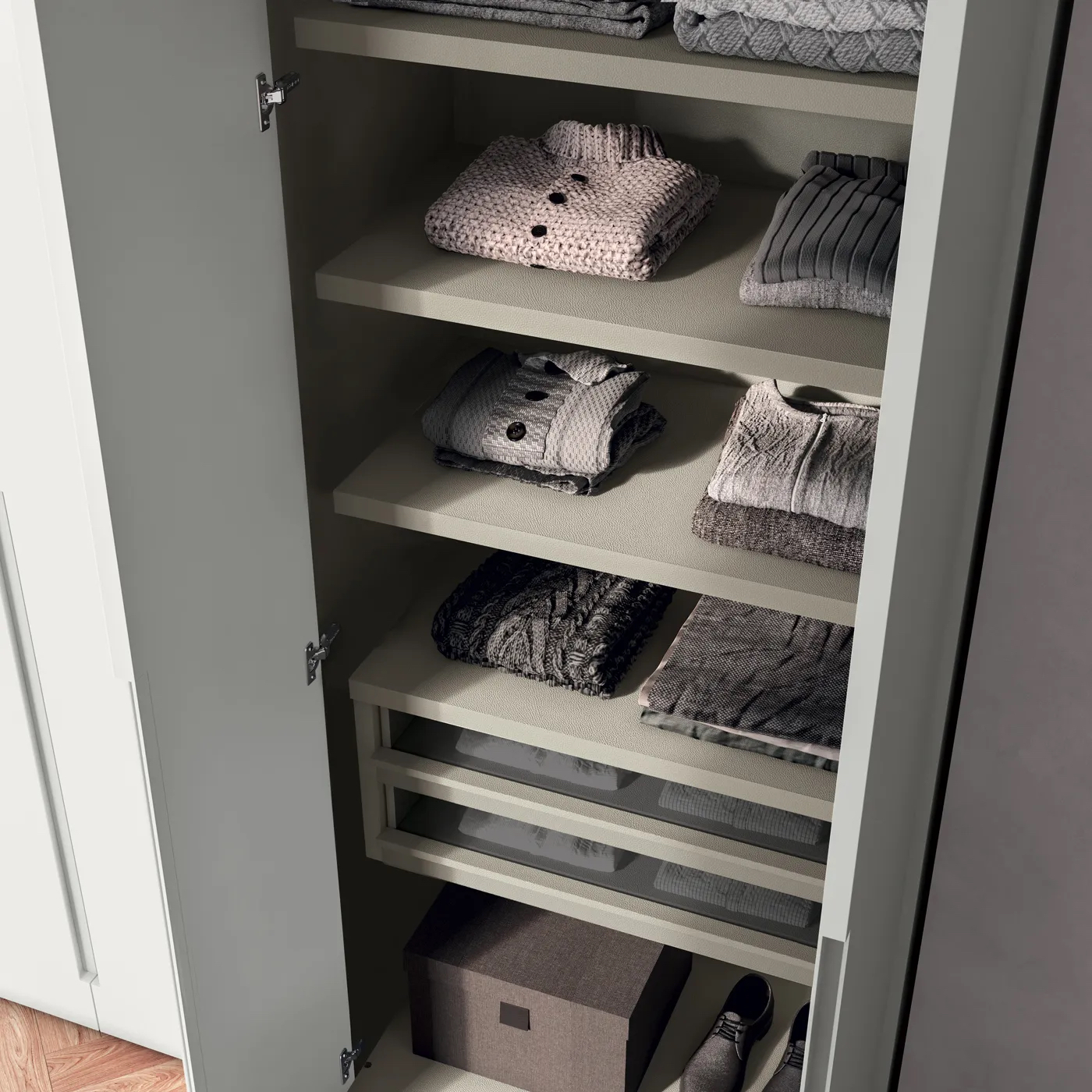 Anta Columbia con gola personalizzabile in tutti i colori opachi della collezione. Cassettiera interna con frontali in vetro Trasparente fumé e interno in nobilitato Leather grey.