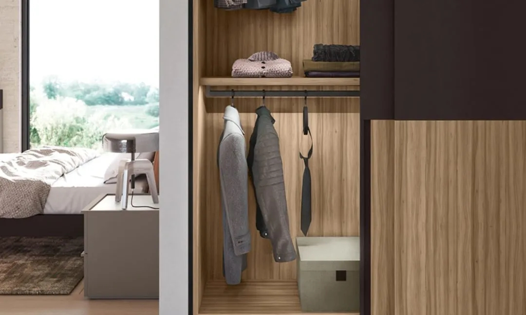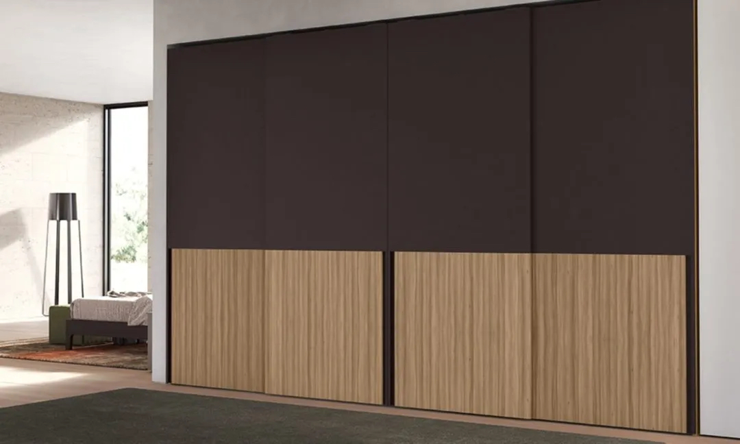 LeWitt sliding door in matt lacquered dark brown and melamine-faced noce gold, matt lacquered dark brown handle. The inner part of the groove handle can be customised in the entire range of colours in a matching shade. Optional internal insert in the entire range of melamine-face colours.LeWitt sliding door in matt lacquered dark brown and melamine-faced noce gold, matt lacquered dark brown handle. The inner part of the groove handle can be customised in the entire range of colours in a matching shade. Optional internal insert in the entire range of melamine-face colours.