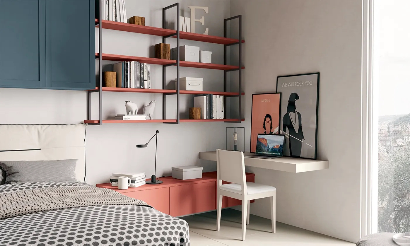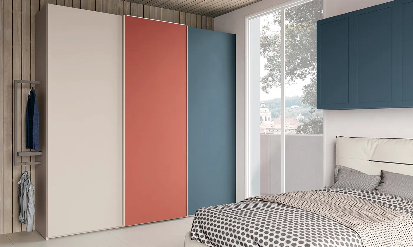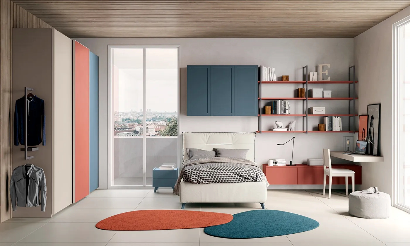 KIDS ROOM / 04 Space for stylistic contaminations in the rooms dedicated to creative young people, where the modernity of the smooth doors of the sliding wardrobe and bookcase coexists with the classic evocation of the framed doors of the wall units. Gallery