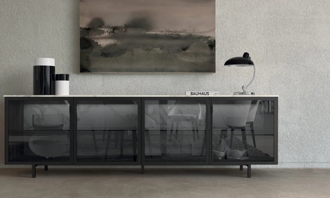 Aurora sideboard with framed doors and sides and melamine-faced Stone grey back panel.