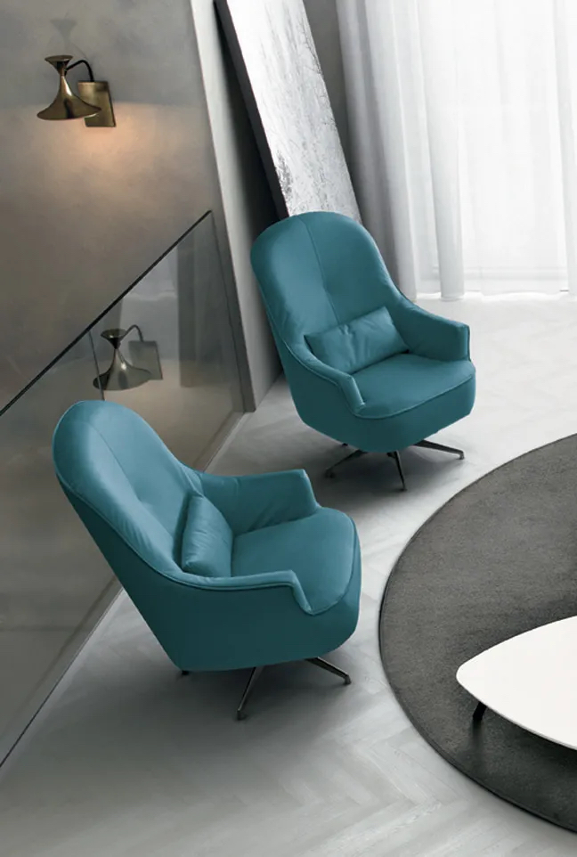 The soft line conceals a sturdy frame; the high back, lower back support and swivel base immediately give CALLA the air of an imposing, solid armchair, but one that is, above all, comfortable.